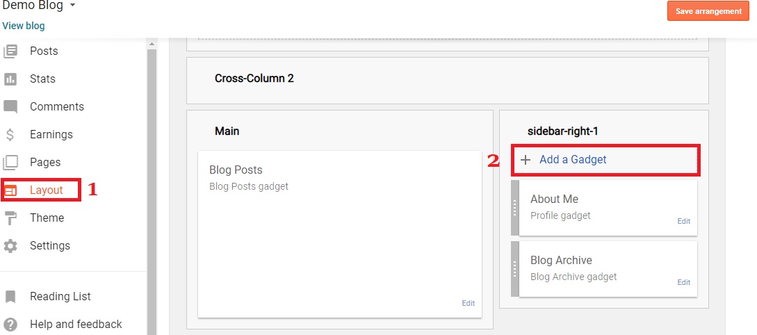 Step 1: Go to Layout>>Cross-column add gadget, just below the blog header and click on add gadget.