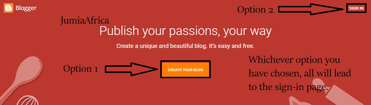 When you land on the blogger.com page, there are two things that you may choose to do that will give you the same result. You may choose to hit "CREATE YOUR BLOG" or "SIGN IN" on the extreme upper right corner of the page. Whichever option you have chosen, all will lead to the sign-in page.